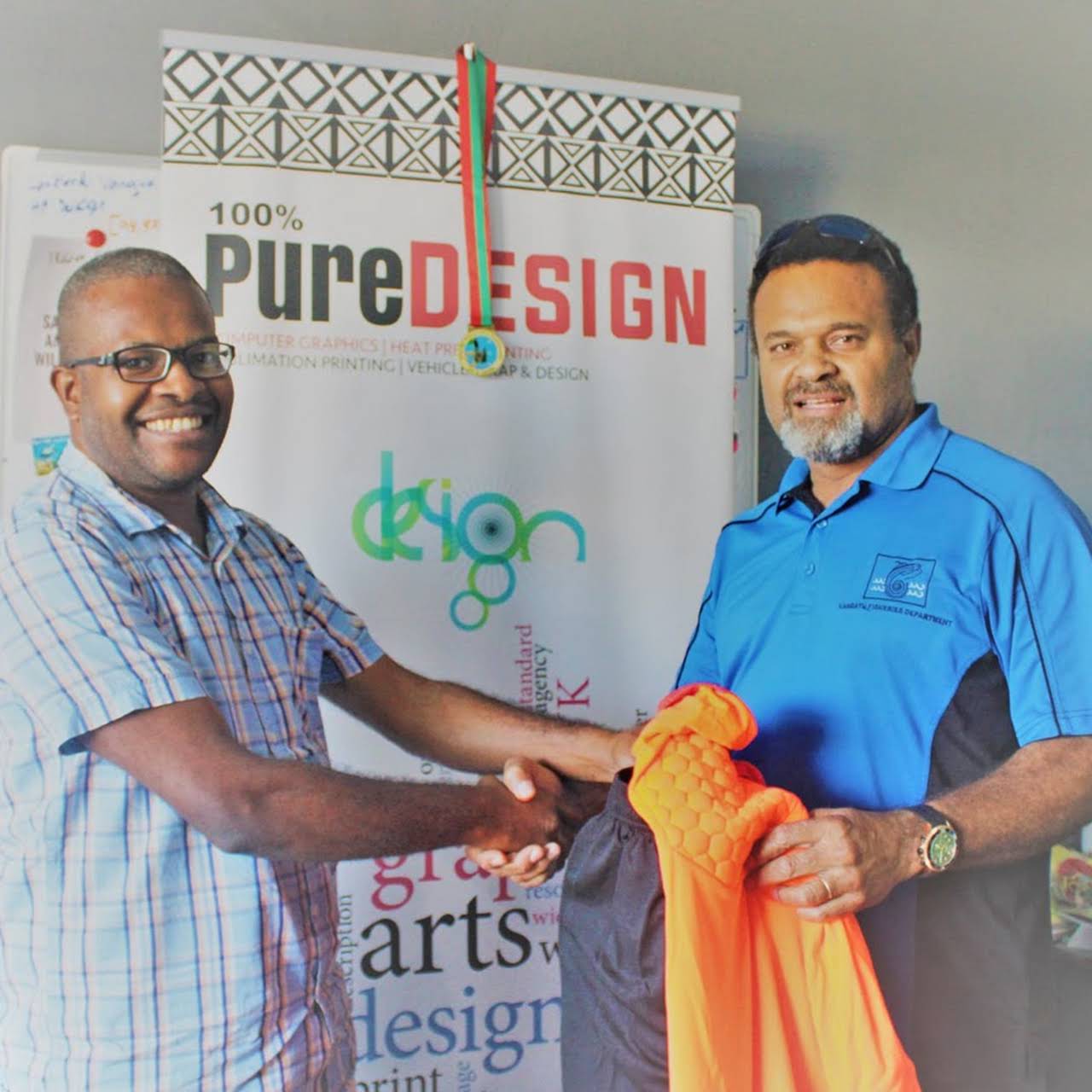 Pele FC hemi risivim fesfala Goalkeeper uniform set blong hem long wik ya ikam long representative blong 100% PURE DESIGN, Mr. Joe Forau. Bifo hemi kivim Goalkeeper uniform set ya iko long President blong Pele FC, Forau italem se lokol design kampani ya hemi hapi blong sapotem ol aktiviti we ol yang pipol oli involve long hem mo oli hope se Goalkeeper uniform set ya bai Pele FC hemi hapi blong usum. Long response President blong Pele FC, Mr. William Naviti italem bikfala thank you iko long 100% Pure Design long positive response iko long request blong klab, mo hemi hapi se naoia klab bai save wok kolosap long wan design kampani we wan man Vanuatu hemi ownem. Ona blong 100% Pure Design i talemaot tu long President blong klab, se design kampani i hapi blong sponsarem live coverage blong match blong Pele FC wetem Redal FC long nekis wik